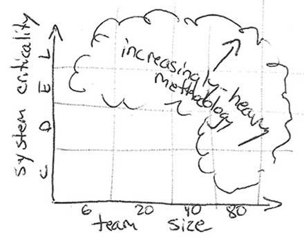 Any project can be evaluated on a 2D graph that shows team size on the X-axis and system criticality on the Y-axis (system criticality refers to the severity of loss in the event of a bug, lowest being an inconvenience and highest being loss of life). Cockburn breaks down the graph into quadrants and explains why projects that stray further from the origin of this graph require heavier methodologies. Even small projects at NASA demand a heavier-weight methodology than the typical web 2.0 app due to criticality. Likewise, even a large non-critical project with many team members like say, the latest Ubuntu Linux distribution, requires a heaver methodology due to the organization required to manage that many team members.
